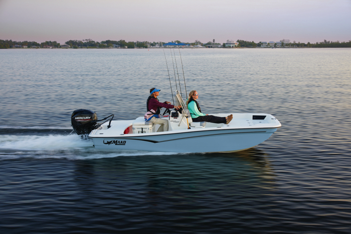 MAKO Pro Skiff 15 CC は、15フィート級ながら最大60HP対応のパワーを備えたフィッシング向けプレジャーボート。AIV設計による高い走破性と安定性、コンパクトな船体で持ち運びやすさも魅力。手軽に釣りやクルーズを楽しみたい人に適した一艇です。